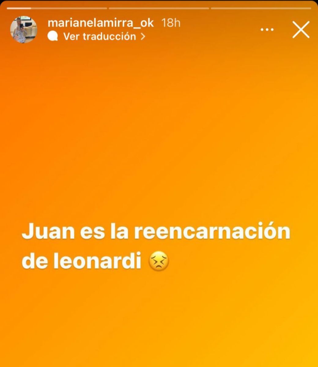 “Juan es la reencarnación de Leonardi”, escribió en una historia de Instagram comparando al actual participante con su compañero de aquel entonces, el cual quedó eliminado por una espontánea que ella le realizó.