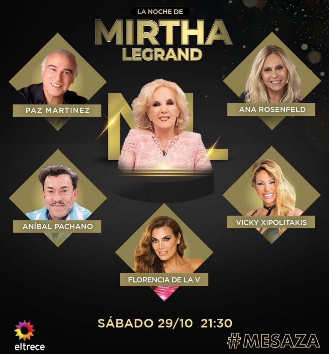 En caso del Mirtha, en la noche del sábado tendrá como invitados a: Florencia de la V, Ana Rosenfeld, Aníbal Pachano, Paz Martínez y Vicky Xipoliatakis.