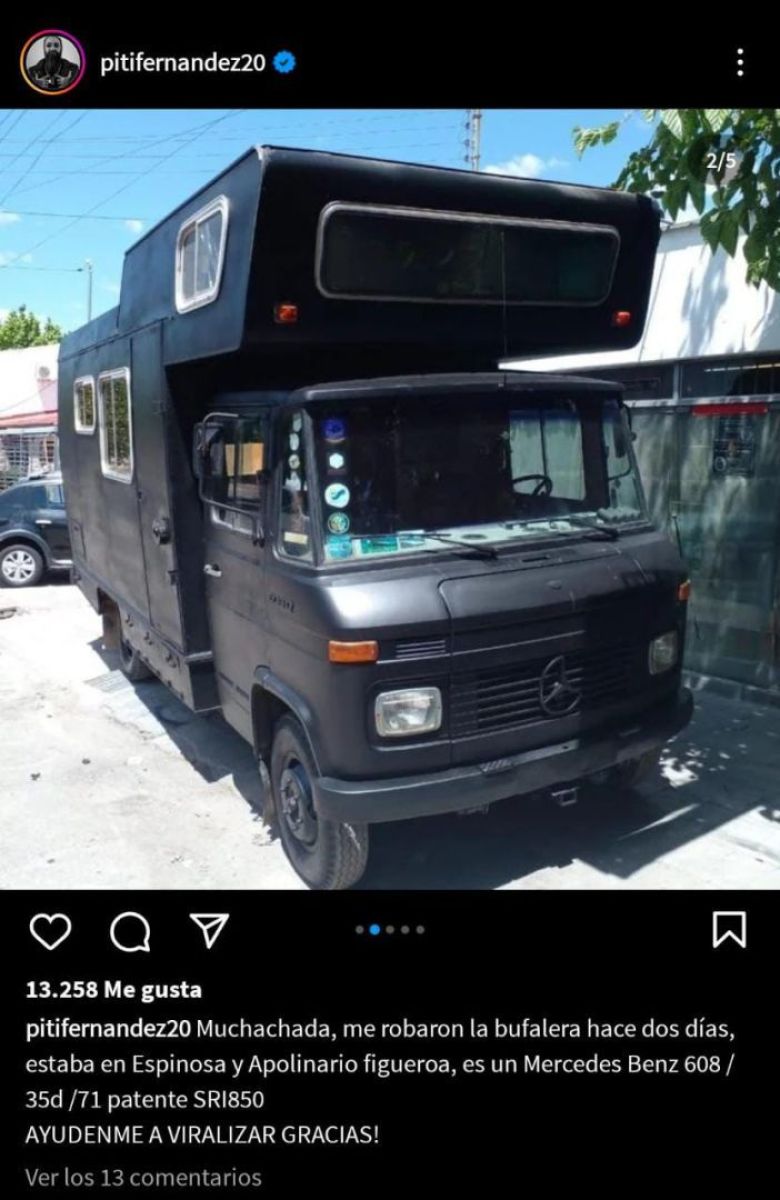 Desde su cuenta de Instagram, Fernández dio a conocer la noticia y expresó: “Muchachada, me robaron la bufalera hace dos días, estaba en Espinosa y Apolinario figueroa, es un Mercedes Benz 608 /35d /71 patente SRI850".