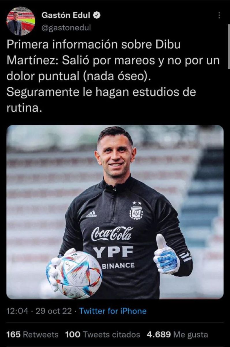 Por último, el periodista Gastón Edul, quién sigue de cerca la actividad de los jugadores de la selección, informó en su cuenta de Twitter: "Primera información sobre Dibu Martínez: Salió por mareos y no por un dolor puntual (nada óseo). Seguramente le hagan estudios de rutina".