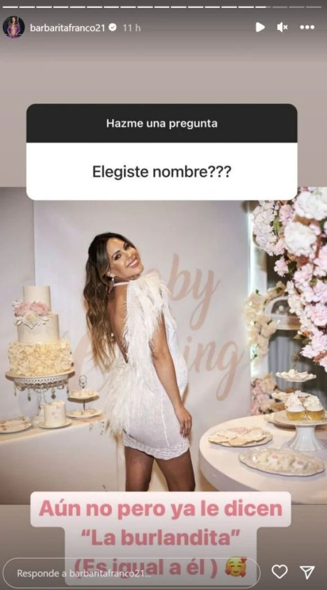 Mediante stories de su cuenta de Instagram, un usuario le consultó:"¿Elegiste el nombre?". A lo que Franco aclaró: "Aún no, pero ya le dicen La Burlandita. Porque es igual a él".