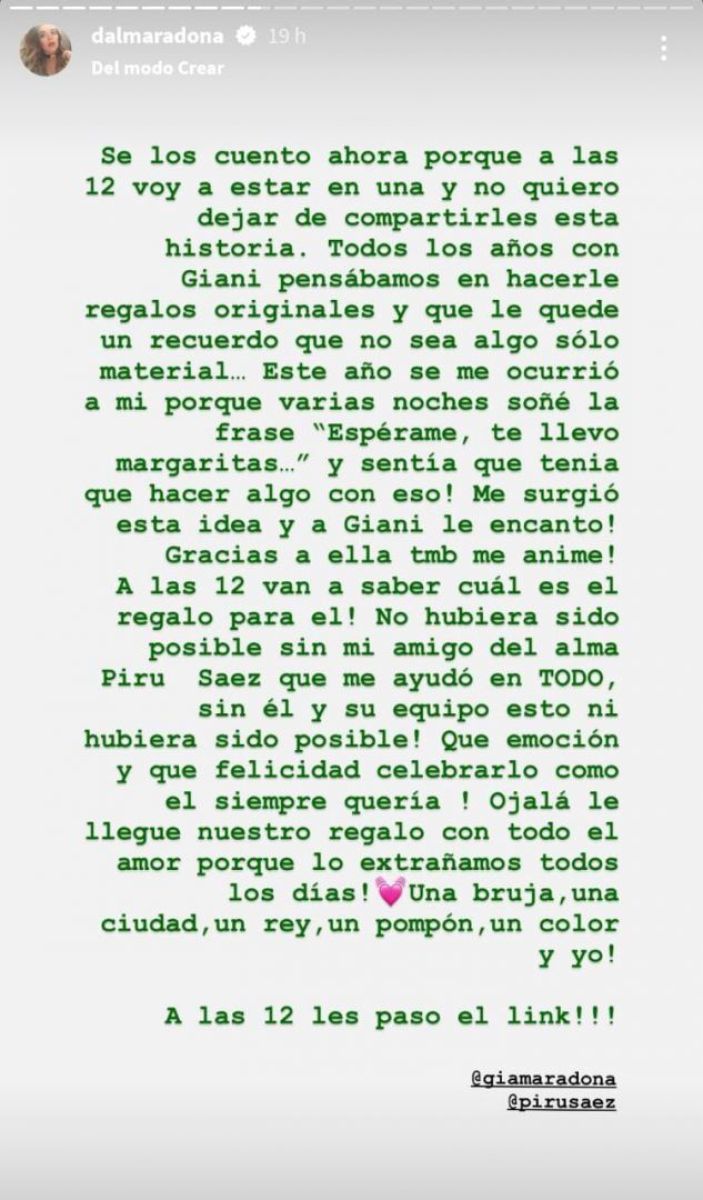 En un extenso texto, la hija del Diego agregó:"Todos los años con Giani pensábamos en hacerle regalos originales y que le quede un recuerdo que no sea algo solo material. Este año se me ocurrió a mí porque varias noches soñé con la frase ‘Esperame, te llevo margaritas’ y sentía que tenía que hacer algo con eso. Me surgió esta idea y a Giani le encantó. Gracias a ella también me animé".