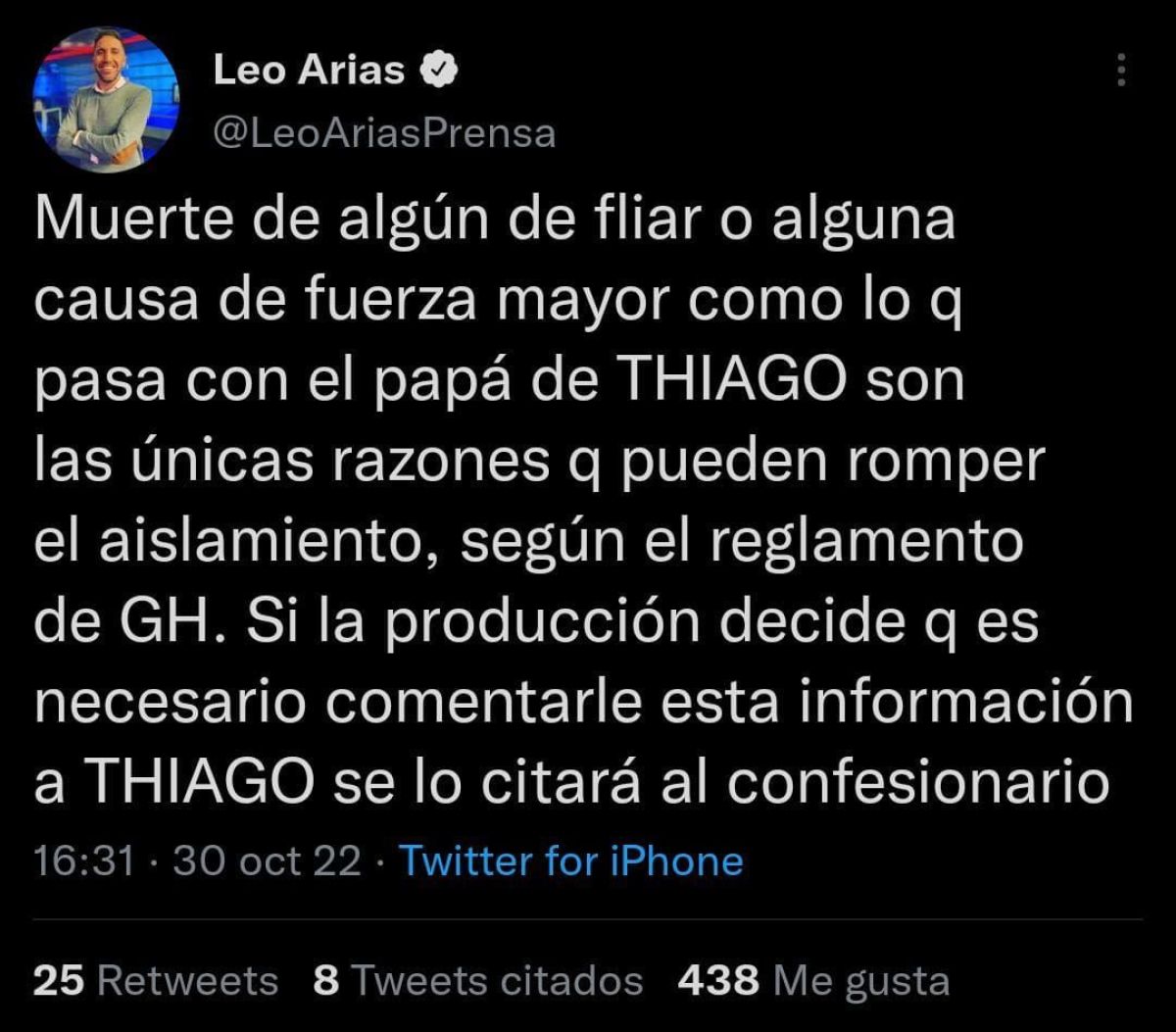 Asimismo, el periodisa de Crónica Tv, Leo Arias, se refirió a lo que pdría suceder con Thiago dentro de la casa de Telefe: “Muerte de algún de familiar o alguna causa de fuerza mayor, como lo que pasa con el papá de Thiago, son las únicas razones que pueden romper el aislamiento, según el reglamento de Gran Hermano”. A lo que sumó: “Si la producción decide que es necesario comentarle esta información a Thiago se lo citará al confesionario”.