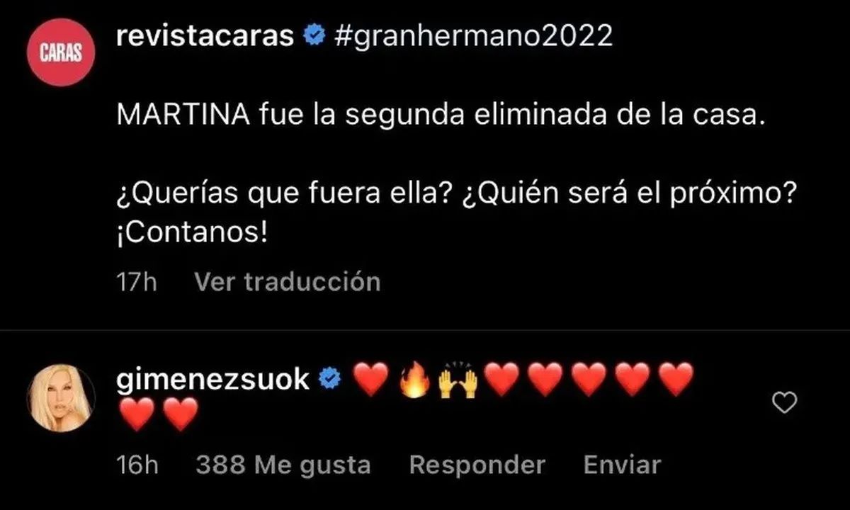 Fue en una publicación de Instagram donde comunicaban la noticia de que Martina abandonó la casa más famosa del país, donde la artista comentó muchos corazones rojos, mostrando cuál era su preferencia.