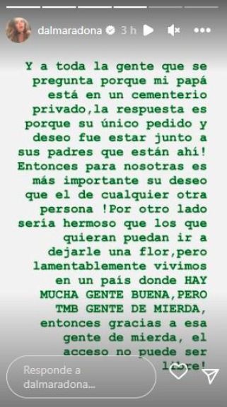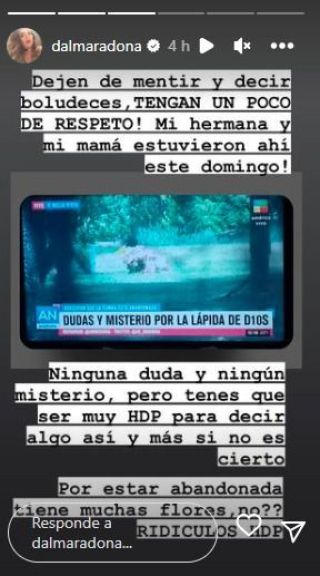 Desde su cuenta de Instagram, la hija mayor de Claudia y Diego, indicó: "Por estar abandonada tiene muchas flores, ¿no? ¡Ridículos! HDP". Luego, Dalma arremetió contra el programa de Guillermo Andino y María Belén Ludueña: "Dejen de mentir y decir boludeces. ¡Tengan un poco de respeto! Mi hermana (Gianinna) y mi mamá estuvieron ahí el domingo".