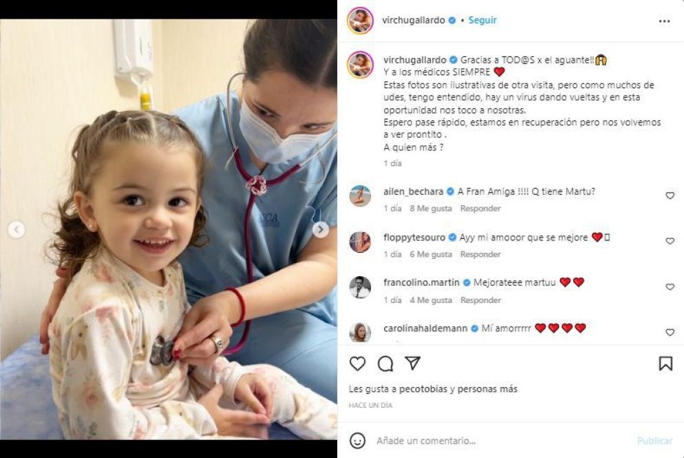 Con una foto de la niña en una sala de una clínica, en la que luce sonriente a pesar de que una profesional de la salud la ausculta, Virginia se lanzó a narrar todo lo que vibró en su interior en estos días convulsionados. "Gracias a todos por el aguante. Y a los médicos siempre", comenzó. Luego especificó: "Estas fotos son ilustrativas de otra visita, pero como muchos de ustedes, tengo entendido, hay un virus dando vueltas y en esta oportunidad nos tocó a nosotras".