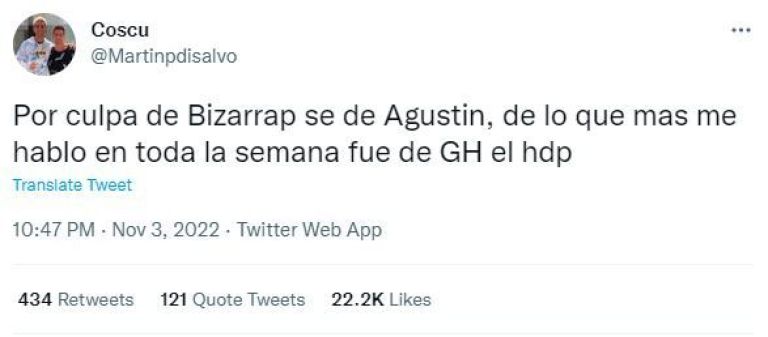 El reconocido streamer tuiteó y mandó al frente al productor musical que se volvió seguidor de lo que sucede en la casa más famosa del país: "Por culpa de Bizarrap sé de Agustín, de lo que más me habló en toda la semana fue de GH el hdp".
