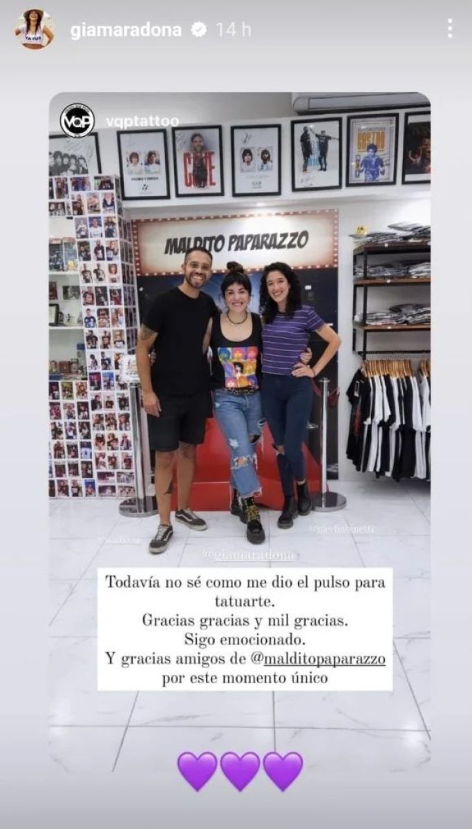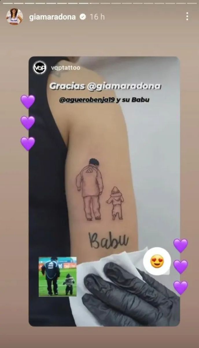 La hija del Diez visitó el estudio de un tatuador, con dos significativas fotos para que el artista las dibujara. La primera foto muestra a su papá y su hijo caminando en un campo de fútbol de espaldas y Debajo, sumó un "Babu", el apodo que Benja le había puesto a su abuelo.