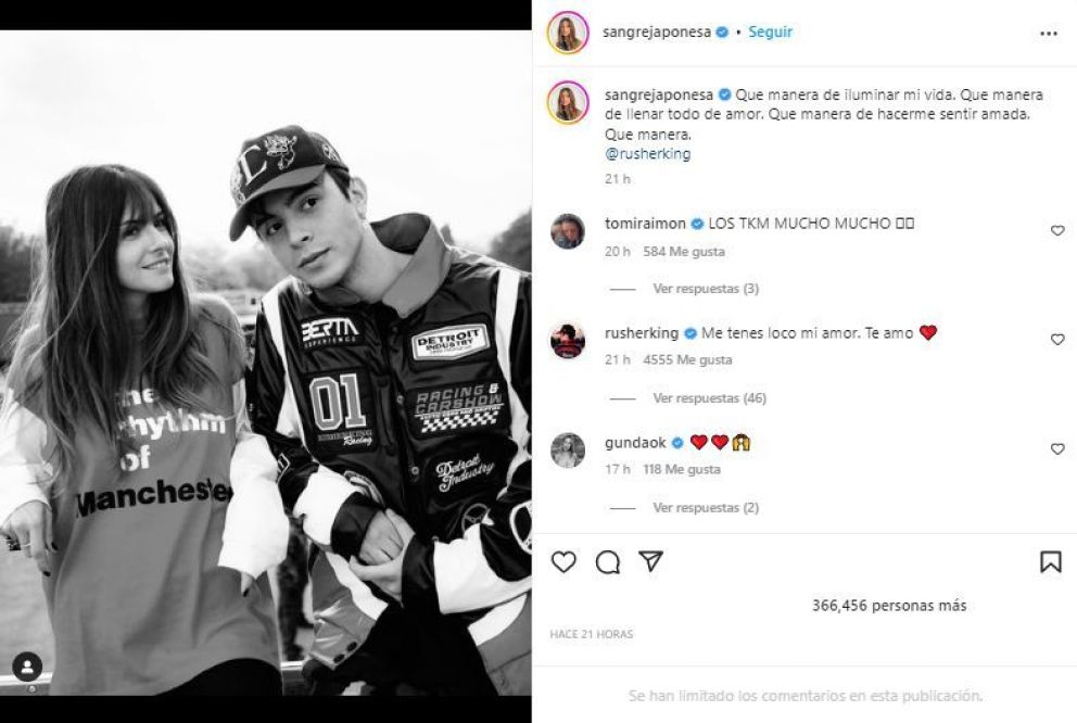 Rusherking no se quedó atrás, y no sólo le respondió la publicación con la frase "Me tenés loco mi amor. Te amo", sino que también compartió las imágenes del reencuentro en su cuenta, con la leyenda "Mi amoooor".