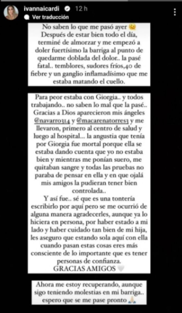 Asimismo, agregó: "La angustia que tenía era mortal. Mientras me ponían suero, me quitaban sangre y me hacían todas las pruebas, no paraba de pensar en mi bebé. Ella se estaba dando cuenta que yo no estaba bien. Cuando pasan estas cosas eres más consciente de lo importante que es tener personas de confianza". "Si no mejoro tengo que volver para que me hagan más pruebas. Espero que no sea nada, nunca me había pasado algo tan fuerte. Si me quedaba acá creo que me moría de dolor. Por lo menos ahora puedo hablar y tengo otra cara", dijo también Ivana.