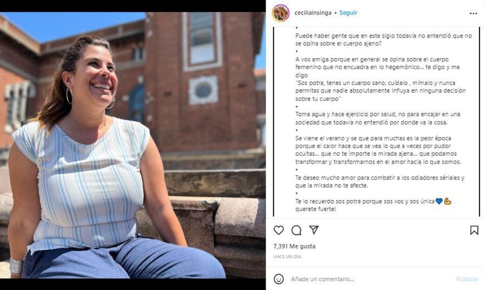 Cecilia Insinga contó que a diario recibe duras críticas referidas a su aspecto físico. Por este motivo decidió realizar un posteo donde llamó a la reflexión y agradeció las muestras de cariño de quienes la apoyan.
