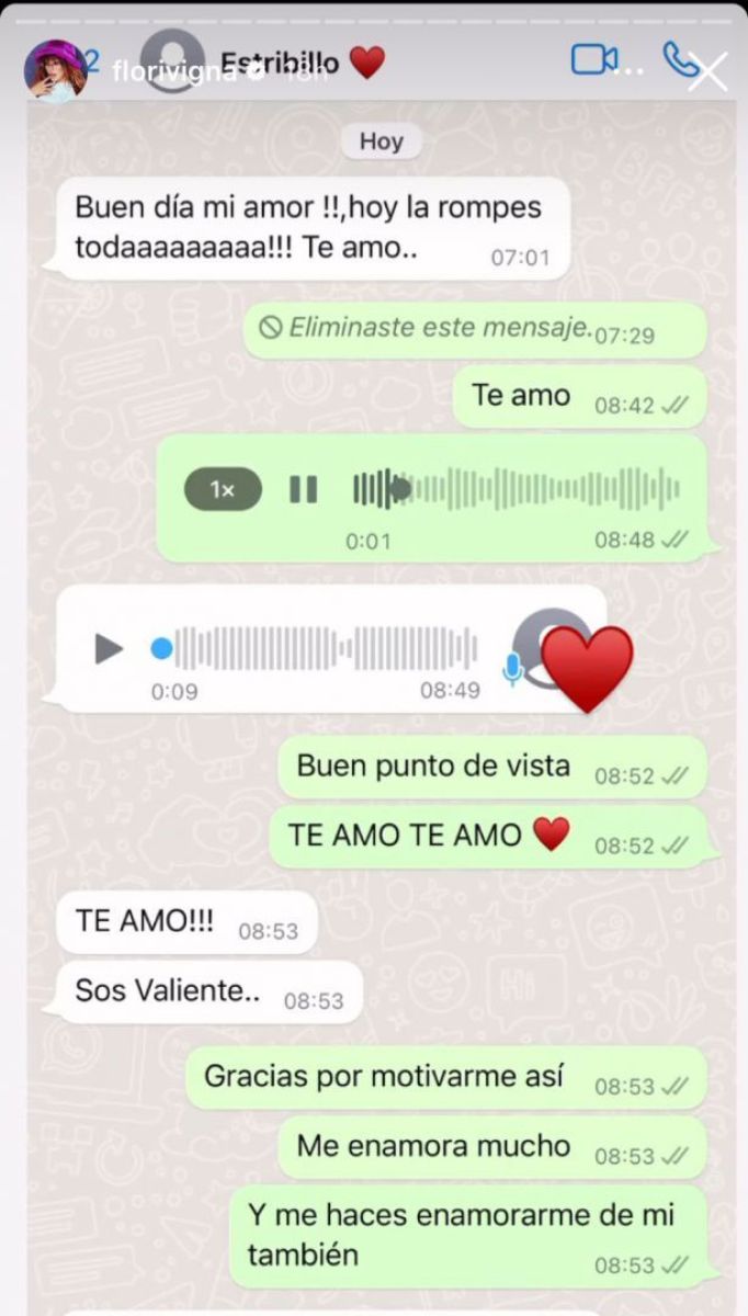Luego se escucha como Flor le transmite estar un poco “cagadita” por el lanzamiento de una nueva canción y el le responde: “Te amo, amor. Está bien que estés un poquito cagadita porque como estas un poquito cagadita, vas a tener que vencerlo a eso y vas a sacar lo mejor de vos como siempre”.