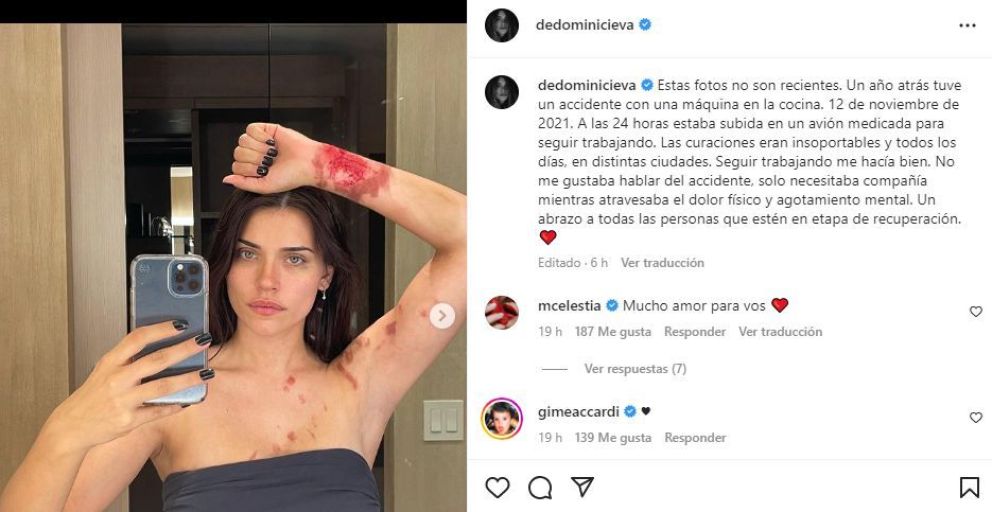 “Seguir trabajando me hacía bien. No me gustaba hablar del accidente, solo necesitaba compañía mientras atravesaba el dolor físico y agotamiento mental. Un abrazo a todas las personas que estén en etapa de recuperación”, concluyó junto a una serie de imágenes de su cuerpo lastimado.