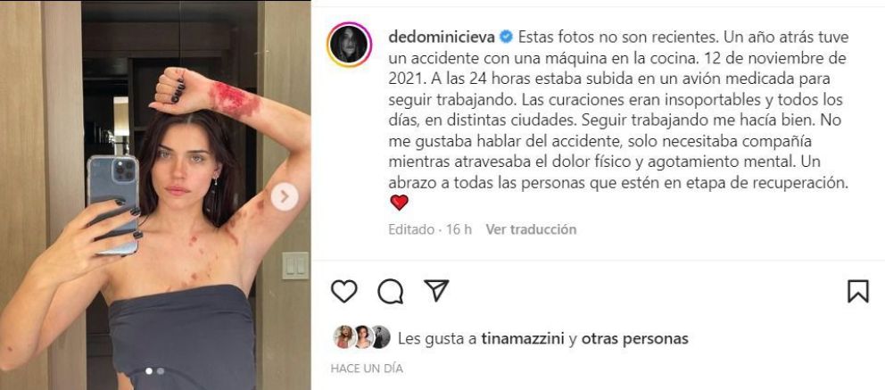 Mediante un posteo, la actriz expresó: “Un año atrás tuve un accidente con una máquina en la cocina. 12 de noviembre de 2021. A las 24 horas estaba subida en un avión medicada para seguir trabajando. Las curaciones eran insoportables y todos los días, en distintas ciudades. Seguir trabajando me hacía bien".