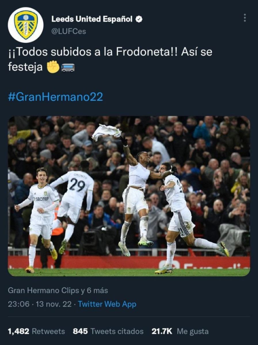 Pero es no es todo, el participante llamó la atención del Leeds United, club de la Premier League que desde su cuenta de Twitter, escribió: ¡Todos subidos a la Frodoneta! Así se festeja".