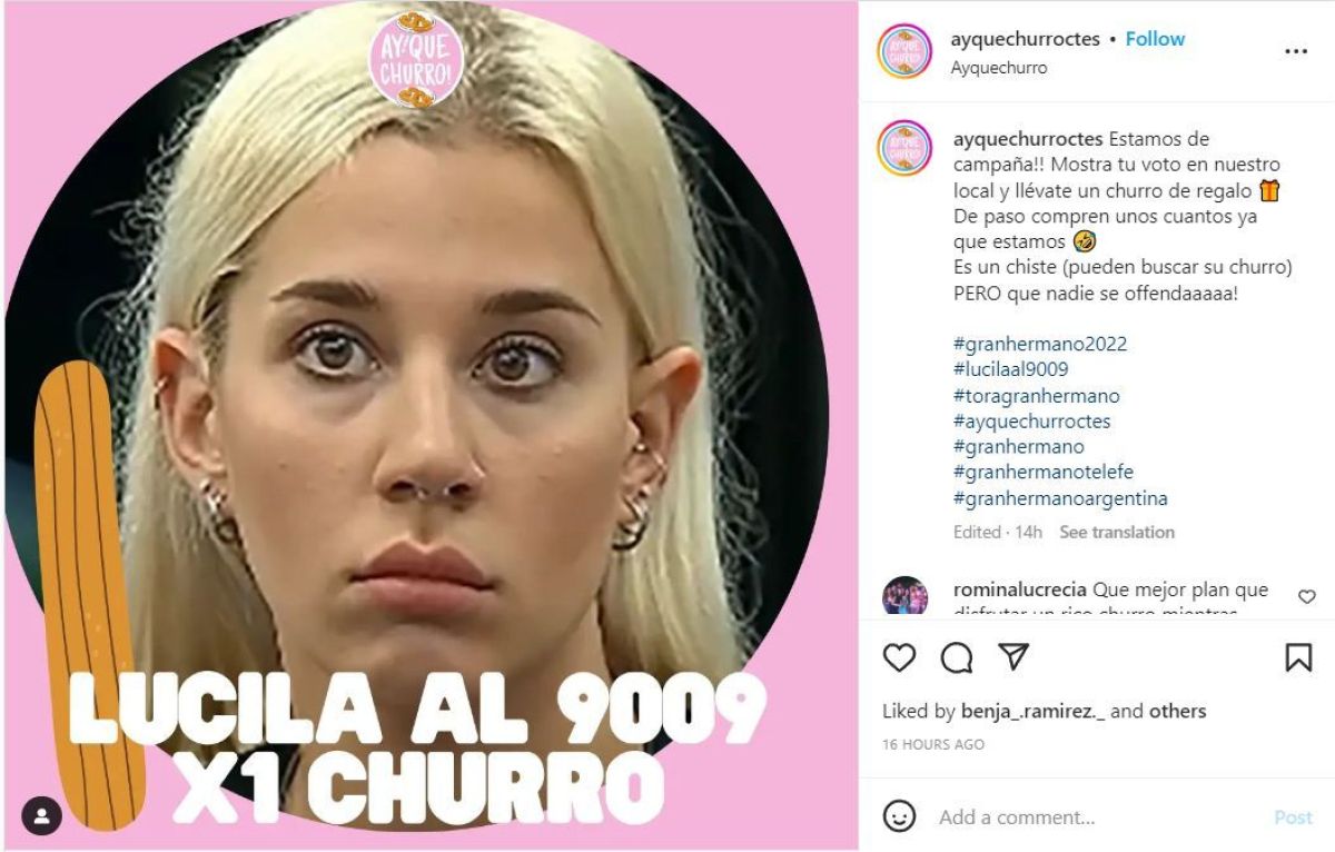 "Estamos de campaña. Mostrá tu voto en nuestro local y llévate un churro de regalo", destaca el comercio @ayquechurroctes en el posteo en que también muestran una foto de la participante a votar, Lucila Villar.