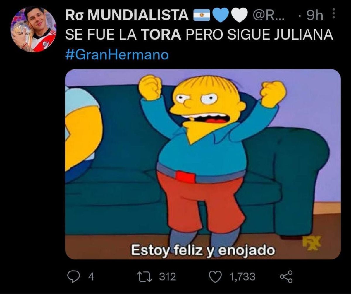 SE FUE LA TORA PERO SIGUE JULIANA #GranHermano pic.twitter.com/5Swx1gqRwd