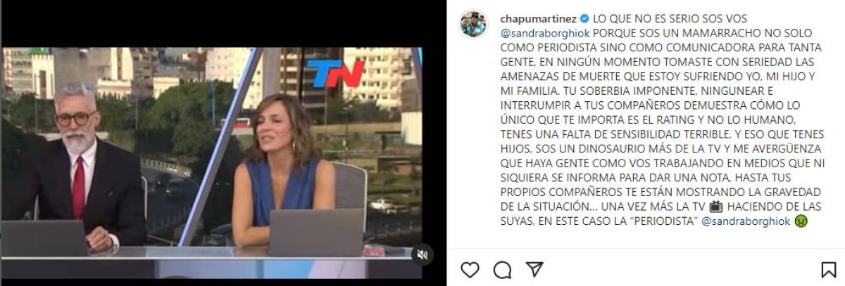 Tras las críticas que recibió el Chapu Martínez en las redes sociales, la periodista Sandra Borghi opinó de manera poco empática en su programa y tuvo dichos cómo: “Si tan mal está, que se vuelva”.