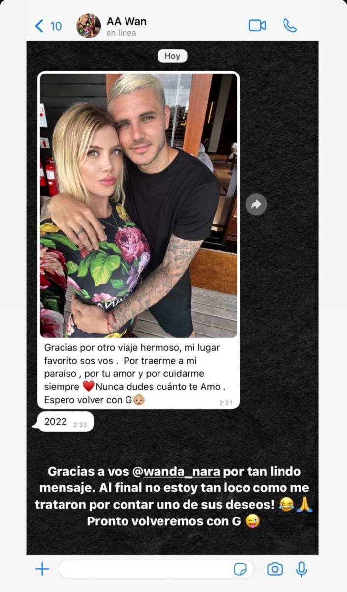 Por su parte, Icardi compartió la foto y expresó: “Gracias a vos Wanda por tan lindo mensaje. Al final no estoy tan loco como me trataron por contar uno de sus deseos. Pronto volveremos con G”.