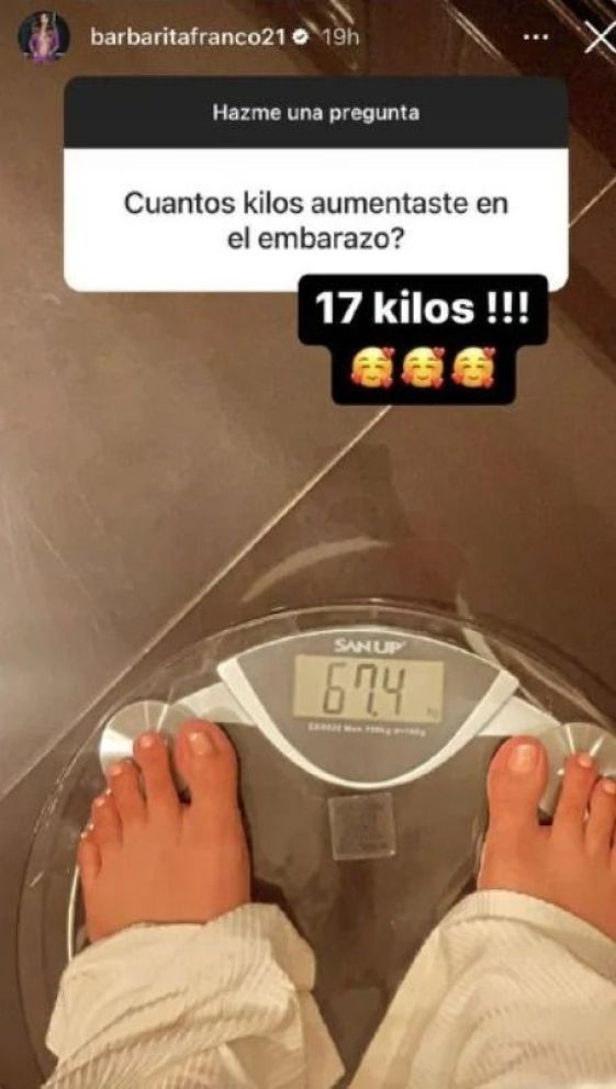 Mediante su cuenta de Instagram, un usuario le consutó a la modelo: "¿Cuántos kilos aumentaste durante el embarazo?". A lo que Barby respondió: "17 kilos", junto a un montón de cariñosos emojis.