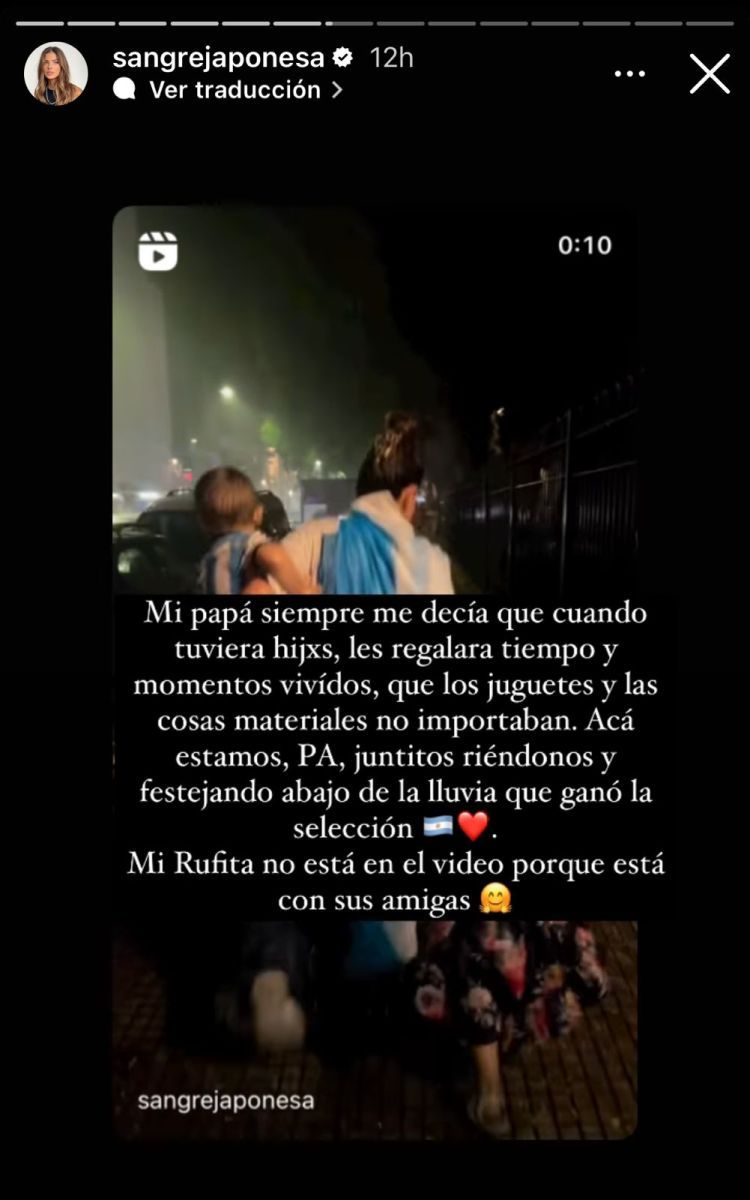 “Acá estamos, Pa, juntitos riéndonos y festejando abajo de la lluvia que ganó la selección. Mi Rufita no está en el video porque está con sus amigas", concluyó.