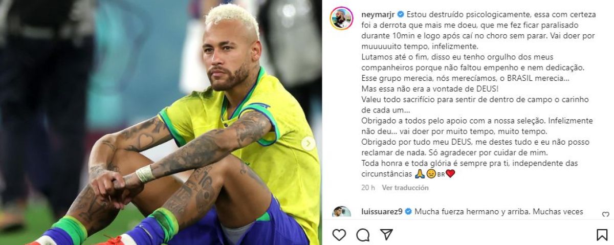 Luego de la eliminación de Brasil del Mundial de Qatar 2022, el futbolista Neymar Júnior publicó un doloroso mensaje en sus redes sociales acerca de cómo se sentía tras lo sucedido.