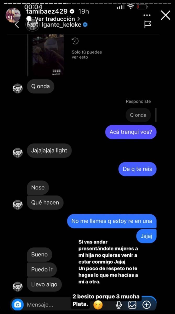 “Si vas andar presentándole mujeres a mi hija no quieras venir a estar conmigo. Jaja. Un poco de respeto, no le hagas lo que me hacías a mí a otra”, escribió Tamara junto a la captura.