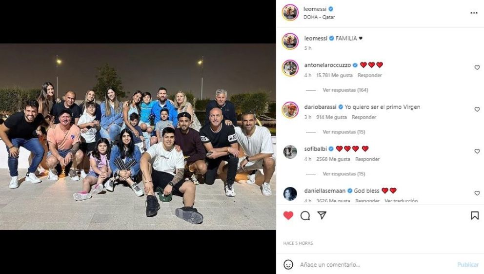 "Familia", escribió Messi en su Instagram, con una foto en la que se ve a su esposa, Antonela Roccuzzo; sus hijos Thiago, Mateo y Ciro, al igual que su padre y representante, Jorge, y su madre, Celia María Cuccittini, entre otros.