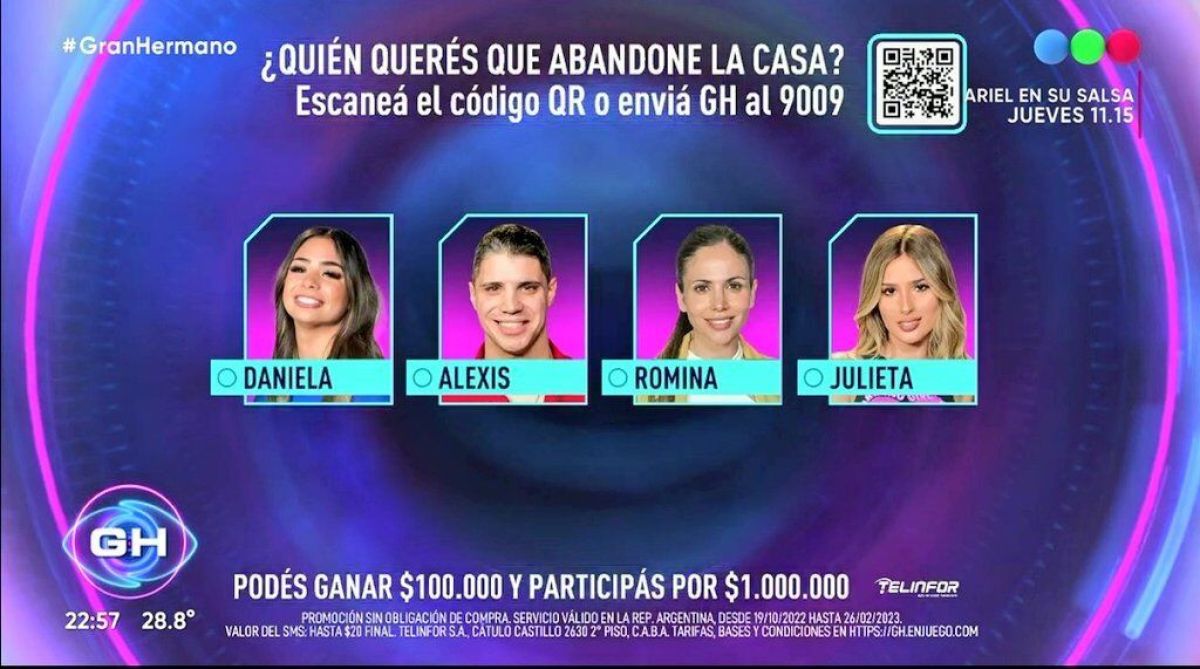 En esta ocasión son 4 los participantes que correrán el riesgo de abandonar el reality el próximo domingo: Daniela, Julieta, Romina y Alexis, el "conejo".