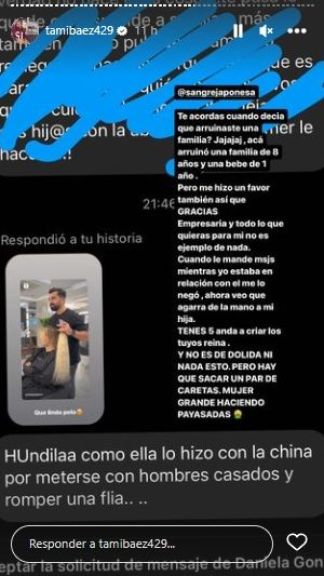Tamara fue durísima desde sus historias de Instagram con la rubia e incluso arrobó en su comentario a la China Suárez. "¿Te acordás cuando decía que arruinaste una familia?", dijo la ex de L-Gante hablándole a la actriz. Y siguió: "Jajaja, acá arruinó una familia de 8 años y una bebé de un año. Pero me hizo un favor también, así que gracias. Empresaria y todo lo que quieras para mí no es ejemplo de nada".
