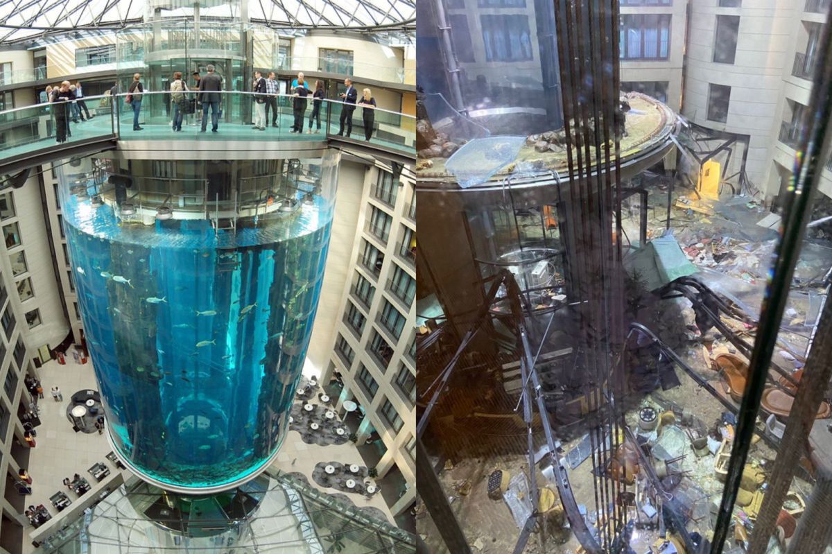 Uno de los acuarios más grandes del mundo, que contenía más de un millón de litros de agua y 1500 peces, estalló en el día de la fecha en el hotel Radisson Blue de Alemania, Berlín.