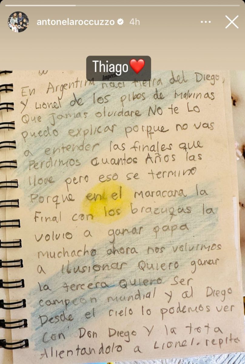 En la carta, Thiago citaba la canción “Muchachos” que se convirtió en un himno para este Mundial. “En Argentina nací tierra del Diego y Lionel de los pibes de Malvinas que jamás olvidaré. No te lo puedo explicar orque no vas a entender las finales que perdimos cuantos años la lloré", comenzó escribiendo y luego conitnuó con la canción.