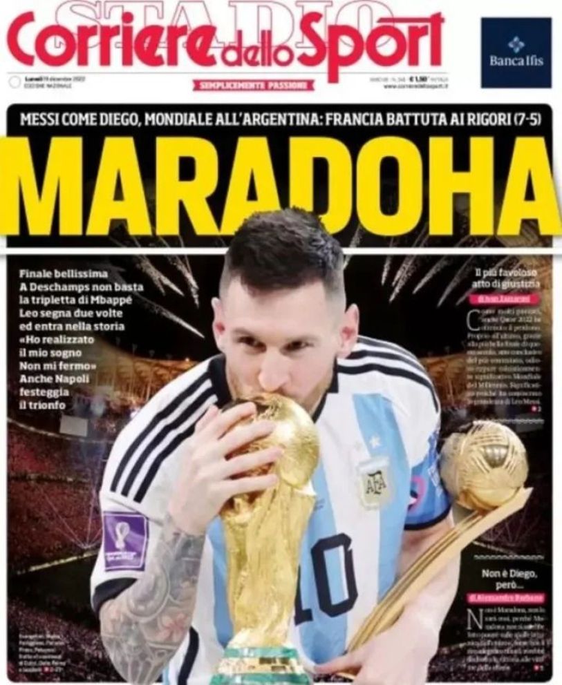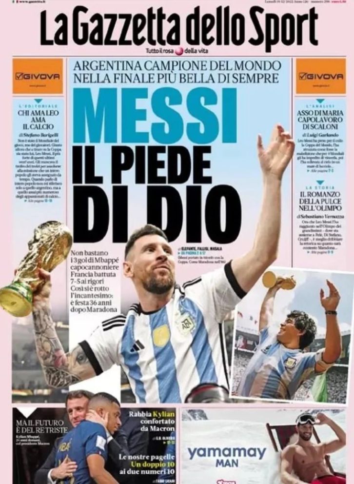 Uno de los diarios de Italia, La Gazzetta dello Sport tituló: "Messi al pie de Dios", con una imagen de él con el trofeo en la mano derecha, y al lado otra de Diego en México 86.