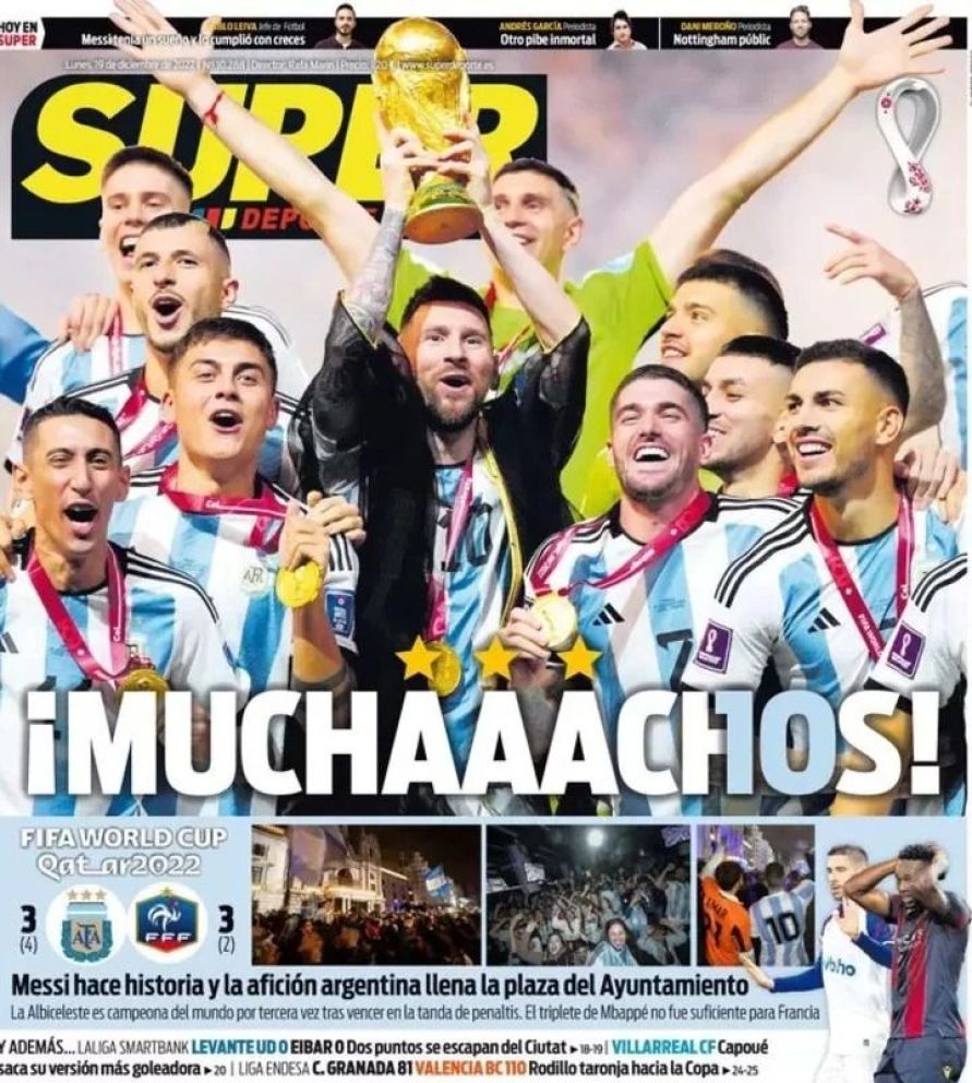Por último, el diario AS titulo "en el cielo", con Messi con el trofeo, llevado en andas por el Kun Agüero. Así Súper Deporte de Valencia usa la palabra "Muchaaaachos", por el hit de La Mosca.