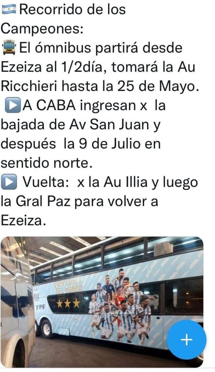 De este modo, el festejo con los hinchas se dará el 20 de diciembre en el Obelisco. Los futbolistas, con Lionel Messi y la Copa del Mundo como principales protagonistas, celebrarán por las calles de la Ciudad de Buenos Aires para agradecer el apoyo.