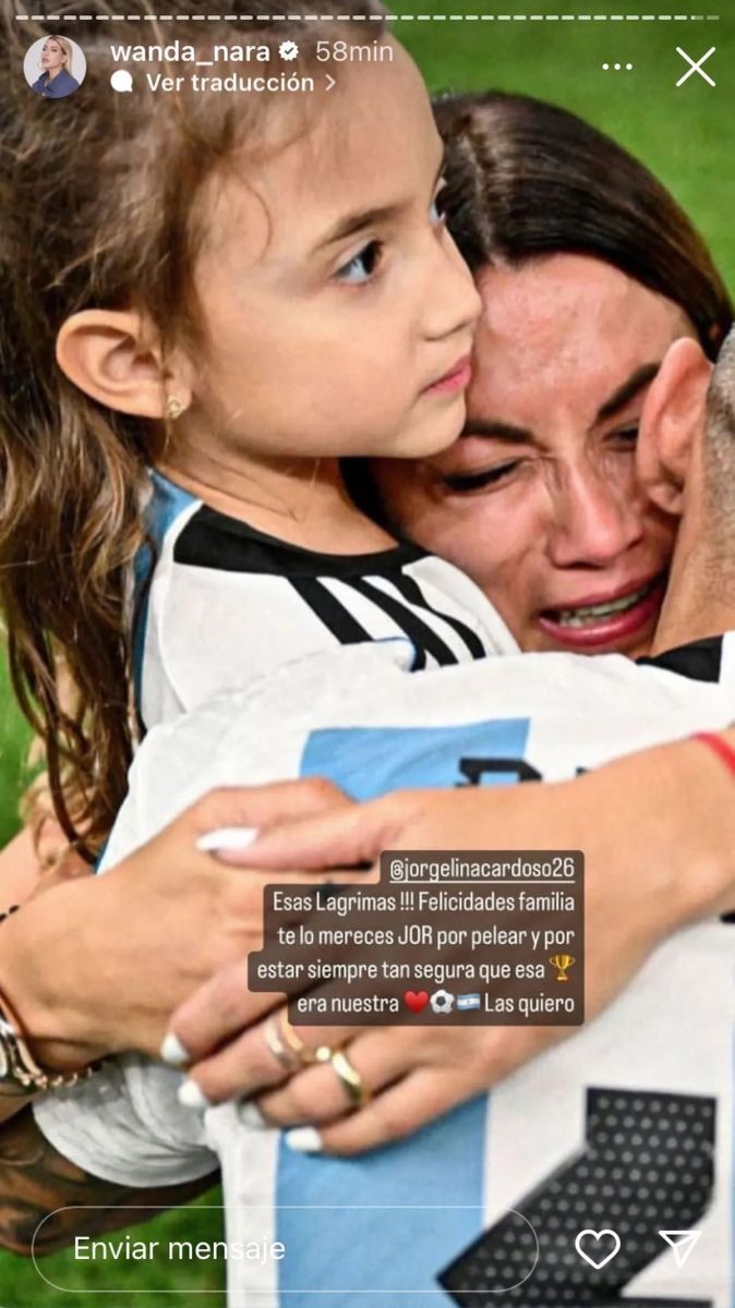 Tras la dedicatoria para Anto, Wanda también le dedicó una emotiva historia a Jorgelina con una imagen en la que se la ve quebrada acompañada de su hija. "Esas lágrimas!!! Felicidades familia te lo merecés JOR por pelear y por estar siempre tan segura que esa copa era nuestra. Las quiero", cerró Wanda.