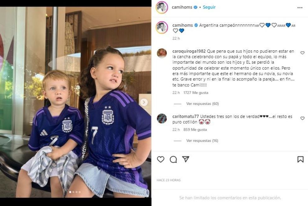 En la publicación que subió en su Instagram, Camila mostró a los niños con la casaca número siete, la misma que utilizó Rodrigo a lo largo de todo el mundial. Así se los ve delante de la transmisión de la espectacular final, incluso Bautista aparece con una copa de juguete.