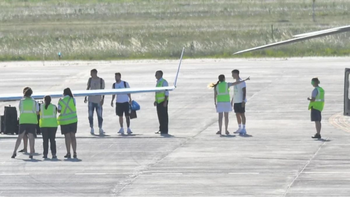 En un vuelo privado que partió desde la localidad bonaerense de San Fernando, los tres campeones del mundo arribaron a la estación aérea a las 18:33 y unos minutos después bajaron de la aeronave.