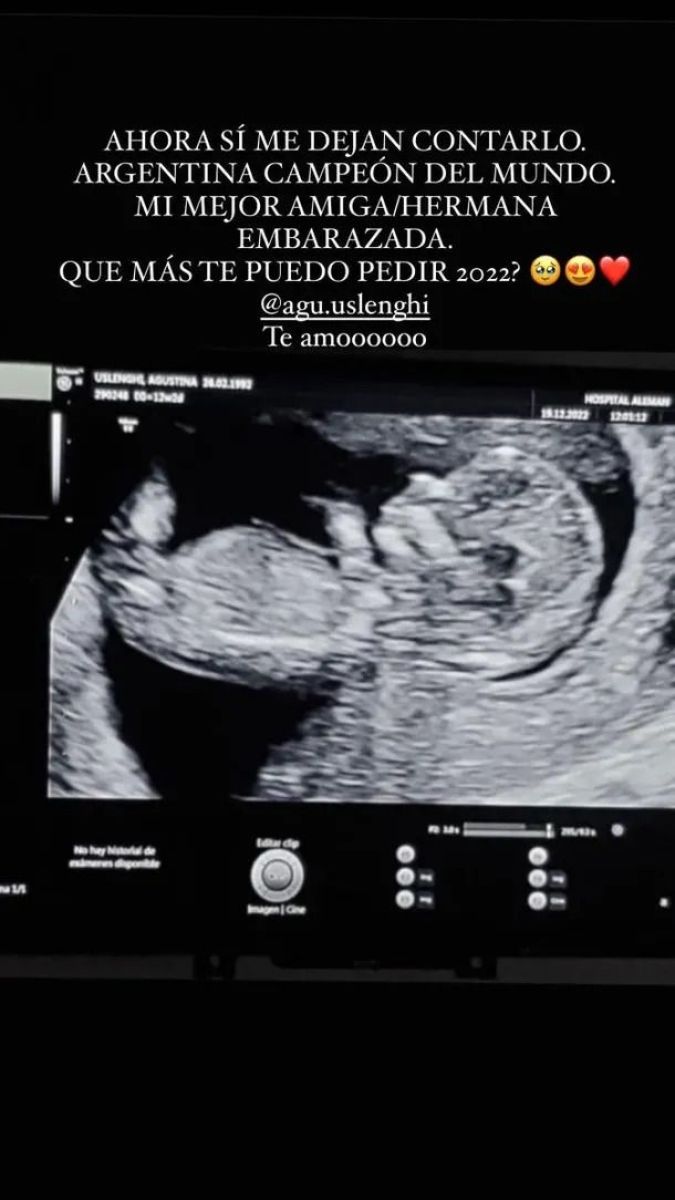 La mamá de Rufina, Amancio y Magnolia compartió una historia de Instagram donde se puede ver una ecografía que se hizo una de sus mejores amigas y lanzó: "Ahora sí me dejan contarlo. Argentina campeón del mundo y mi mejor amiga/hermana embarazada".