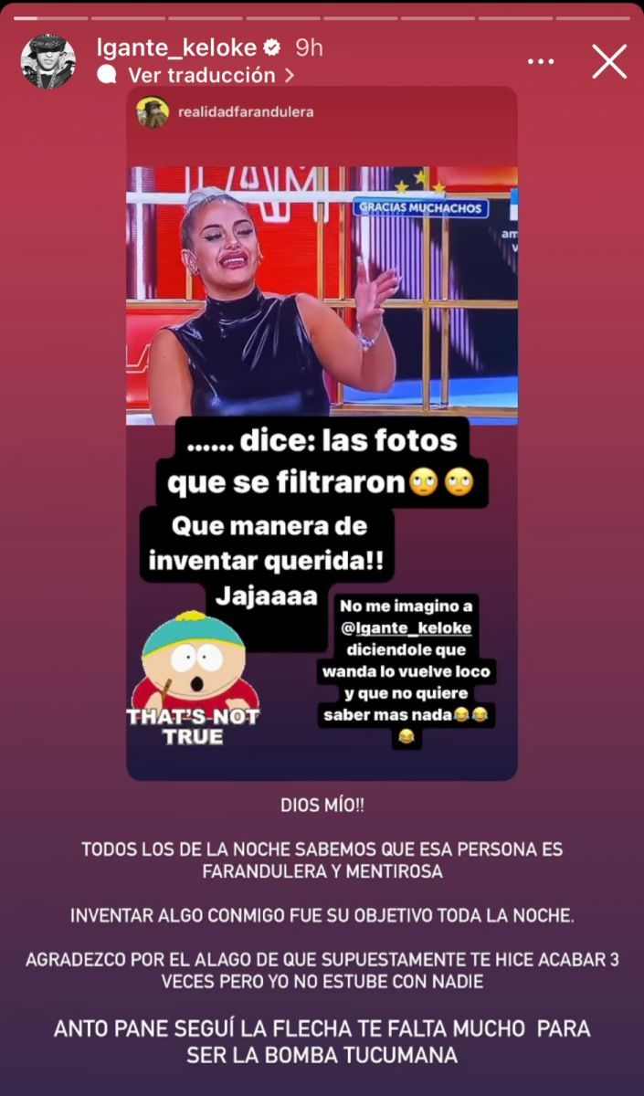Ante la situación, L-Gante se expresó furioso en sus historias de Instagram y sentenció: “Todos los de la noche sabemos que esa persona es farandulera y mentirosa. Inventar algo conmigo fue su objetivo toda la noche”.
