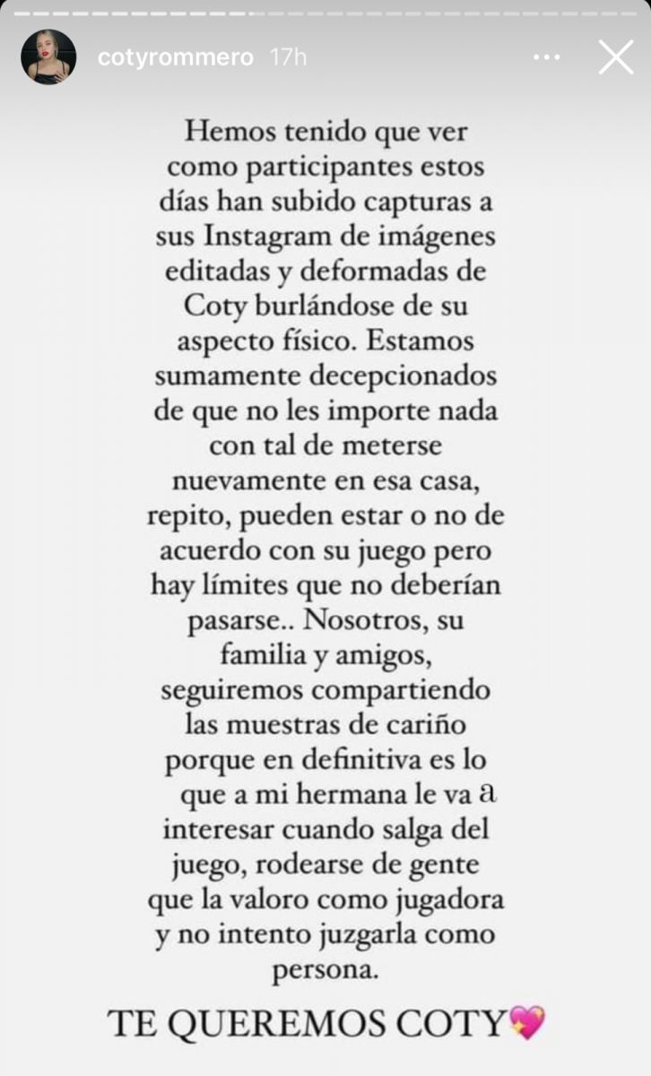 A través de las redes de la correntina, su familia escribió: "Hemos tenido que ver cómo participantes estos días han subido capturas a sus Instagram de imágenes editadas y deformadas de Coti burlándose de su aspecto físico. Estamos sumamente decepcionados de que no les importe nada con tal de meterse nuevamente en esa casa”.