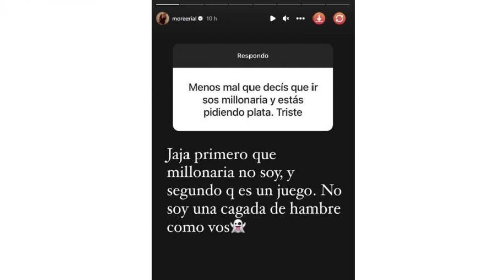 Ante esta situación un usuario respondió: "Menos mal que decís que sos millonaria y estás pidiendo plata. Triste". Muy picante, Morena apuntó: "Primero que millonaria no soy, y segundo que es un juego. No soy una cagada de hambre como vos", sentenció la mamá de Francesco junto al emoji de un fantasma.