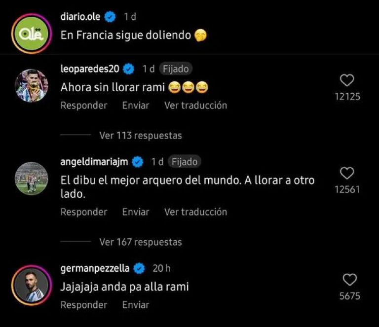 Tanto Di María, Paredes y Pezzela, salieron a defender a Martínez de una manera particular contra Rami tras su salida de tono. El extremo comentó: "El Dibu es el mejor arquero del mundo, a llorar a otro lado".El mediocampista, continuó: "Ahora dilo sin llorar Rami". Pero el que resaltó fue el defensor que hizo alusión a la frase de Leo Messi a Weghorst, le comentó: "Andá pa allá Rami".