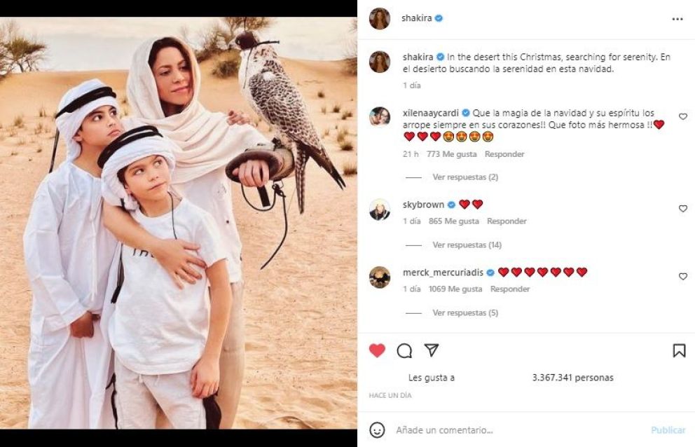 En medio de la escapada subió una postal para compartir con sus seguidores detalles del viaje. “En el desierto buscando la serenidad en esta navidad”, señaló. En la imagen se la ve junto a sus dos hijos, y sosteniendo un halcón.