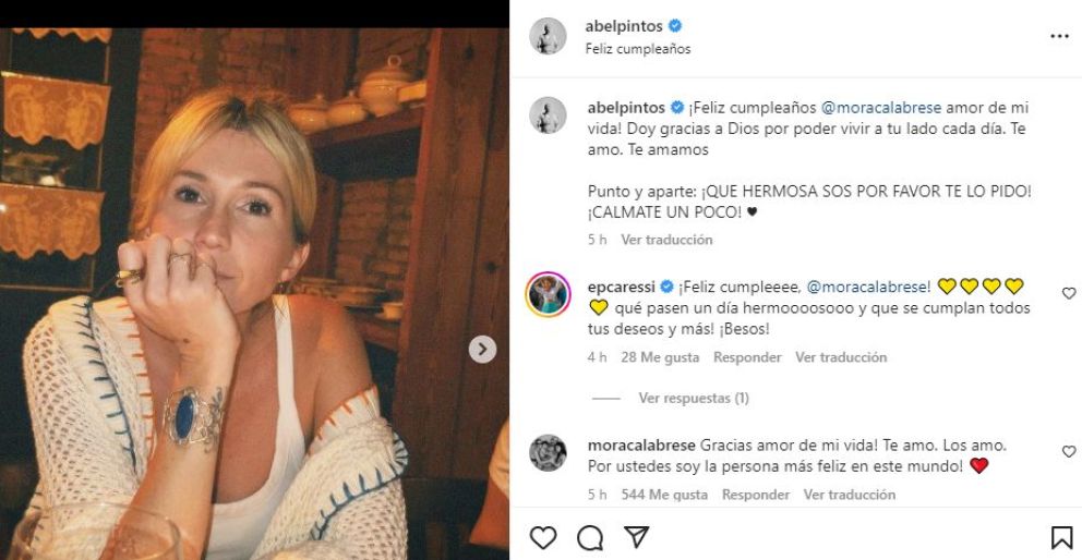 “Feliz cumpleaños @moracalabrese amor de mi vida! Doy gracia a Dios de poder vivir a tu lado cada día. Te amo. Te amamos!”, expresó Abel junto a dos fotos de ella.