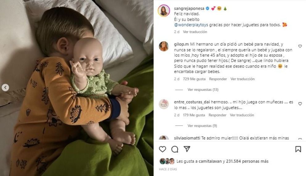 En su cuenta de Instagram, la artista expresó en su posteo: "Feliz Navidad, él y su bebito... Gracias por hacer juguetes para todxs". La artista lo comunicó con lenguaje inclusivo.
