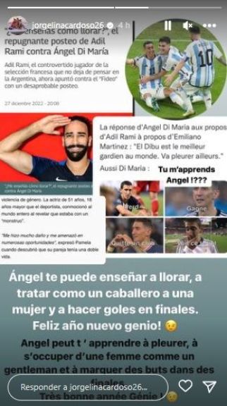Prueba de ello son las recientes declaraciones de Adil Rami. "¿Me enseñas a llorar?", escribió el futbolista, en un posteo en el cual se veían varias fotos del "Fideo". En su cuenta de Instagram, la mujer de Di María, Jorgelina Cardoso, le contestó al francés recordándole dichos de su ex pareja, Pamela Anderson, que lo denunció por violencia de género.