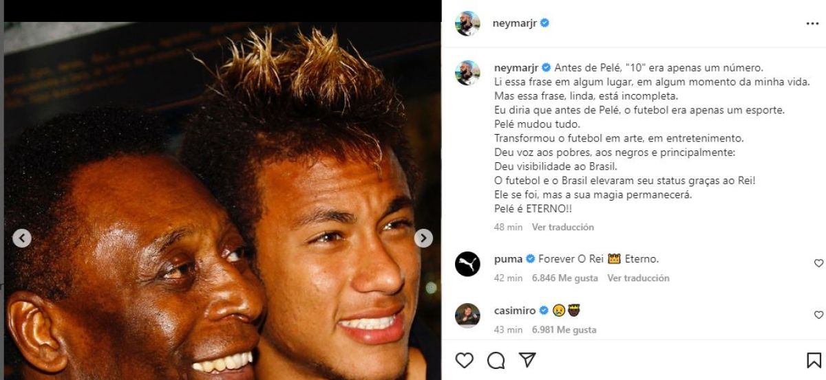 “Antes de Pelé, el 10 era solo un número. Leí esa frase en algún lugar, en algún momento de mi vida. Pero esa frase, preciosa, está incompleta. Yo diría que antes de Pelé, el fútbol era solo un deporte”, comenzó escribiendo junto a fotos de ambos.