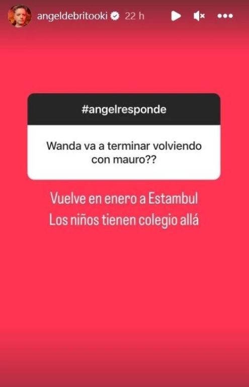 Así lo reveló Ángel de Brito, en su sección de ida y vuelta de preguntas de Instagram, Ángel Responde. “¿Wanda va a terminar volviendo con Mauro?”, quiso saber un seguidor, y el conductor de LAM señaló: "Vuelve en enero a Estambul". Luego, aclaró los motivos del pronto regreso: “Los niños tienen colegio allá".