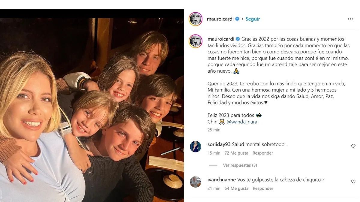 Por último, el delantero expresó: "Querido 2023, te recibo con lo mas lindo que tengo en mi vida, Mi familia. Con una hermosa mujer a mi lado y 5 hermosos niños. Deseo que la vida nos siga dando Salud, Amor, Paz, Felicidad y muchos éxitos.Feliz 2023 para todos. Chin Wanda Nara".